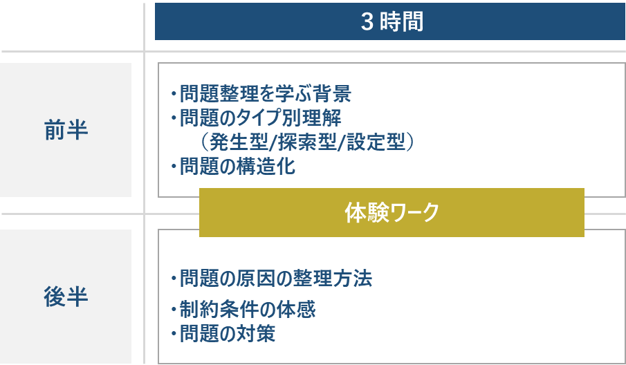 概要 | 正解のない時代、経験や勘だけでは前に進めません。 本セミナーでは、問題解決の前段階である「問題整理」の技法を体系的に学びます。 もやもやを構造化し、問題の「見える化」「言える化」「訊ける化」で、思考のスピードと精度が飛躍的に向上します。 問題構造化理論(構造的洞察法)の創案者佐藤允一先生の「問題構造学」をベースに、問題整理法をわかりやすくお伝えします。 |